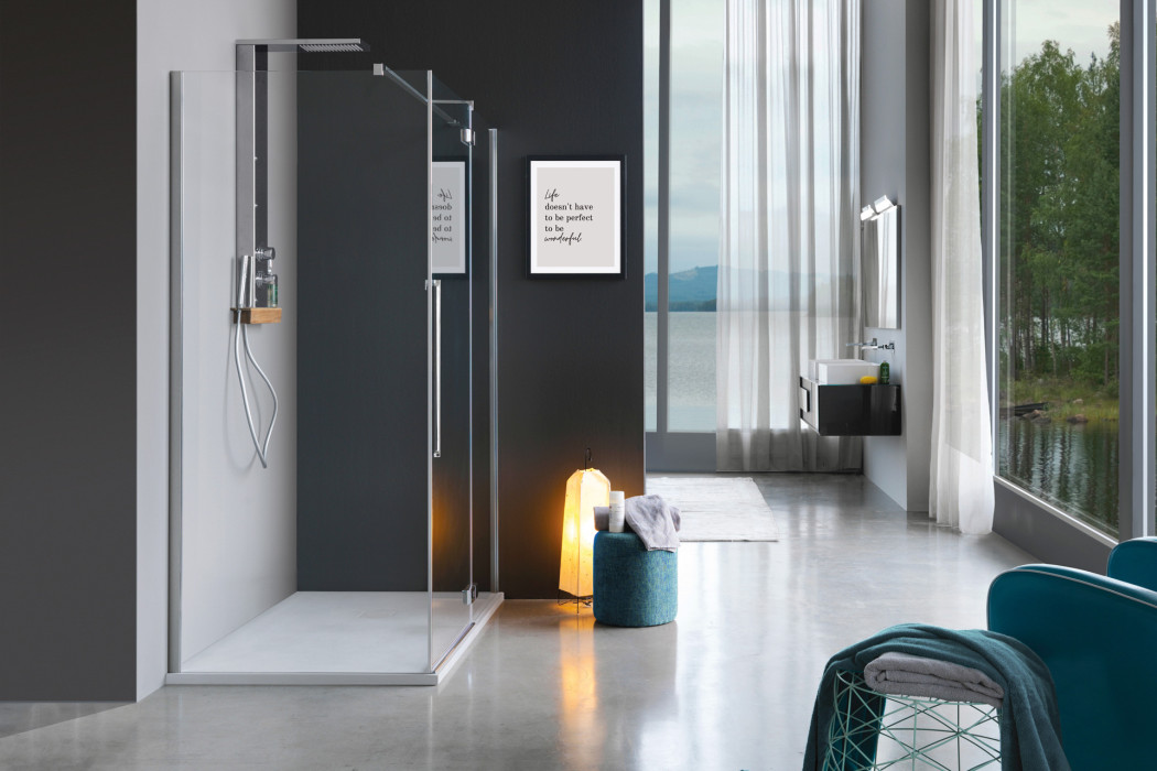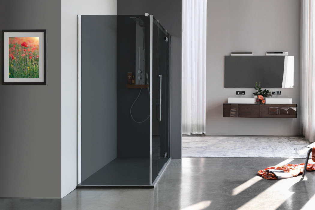 Parete doccia in configurazione ad angolo formata da due porte battenti con parete fissa in linea. L’apertura dell’anta è sia verso l’interno che verso l’esterno. Modello ad alto impatto estetico e disponibile in dimensioni maggiori rispetto ad una tradizionale porta.