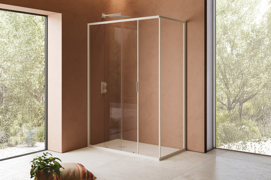 Paroi de douche à deux panneaux avec ouverture latérale coulissante et paroi fixe dédiée pour les configurations d'angle. Modèle adapté à la plupart des installations et disponible dans une large gamme de tailles.