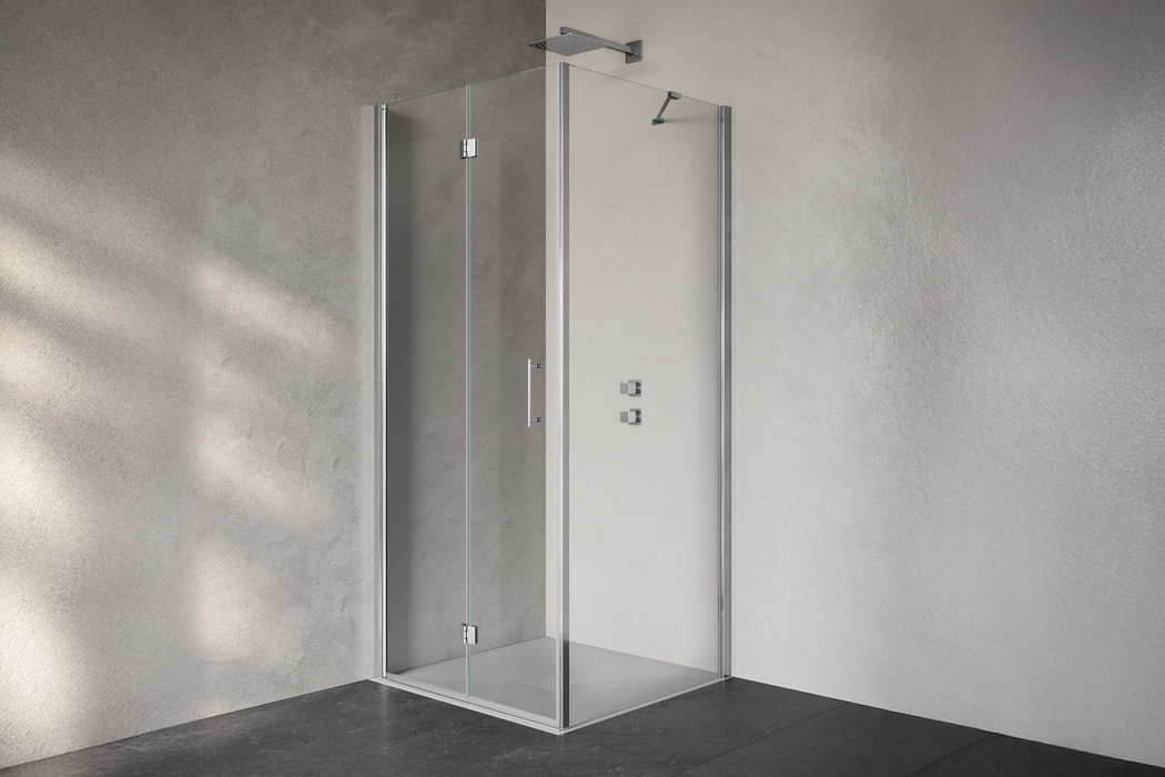 Parete doccia in configurazione ad angolo formata da due porte battenti sezionabili. L’apertura dell’anta è sia verso l’interno che verso l’esterno. Modello adatto per situazioni che necessitano della massima apertura possibile.